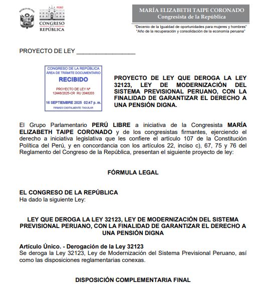 En septiembre del presente año se ingresó en la Comisión de Economía del Congreso de la República, el Proyecto de Ley 12446/2025-CR de la congresista Ana Elizabeth Taipe, que propone derogar la Ley de Modernización del Sistema Previsional Peruano (), así como las disposiciones reglamentarias conexas.