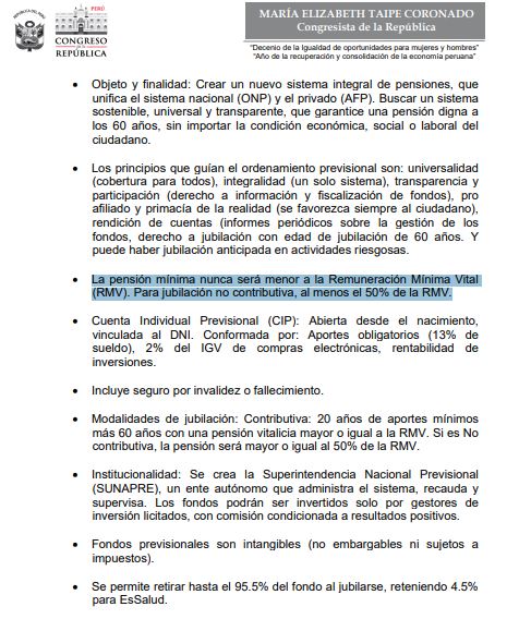 El proyecto de ley propone terminar con el sistema dual ONP-AFP y reemplazarlo por un sistema único de cuentas individuales previsionales administrado por una entidad denominada SUNAPRE, con pensión mínima garantizada, opción de retiro del 95.5%, y un fondo solidario para quienes no aportaron lo suficiente. En dicha iniciativa se establecía:
