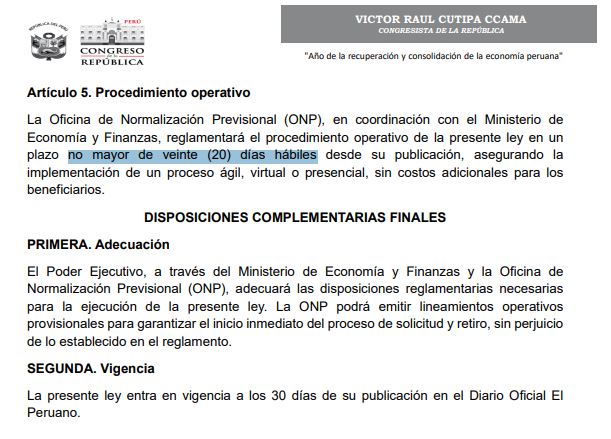 Artículo 5. Procedimiento operativo La Oficina de Normalización Previsional (ONP), en coordinación con el Ministerio de Economía y Finanzas, reglamentará el procedimiento operativo de la presente ley en un plazo no mayor de veinte (20) días hábiles desde su publicación, asegurando la implementación de un proceso ágil, virtual o presencial, sin costos adicionales para los beneficiarios.
