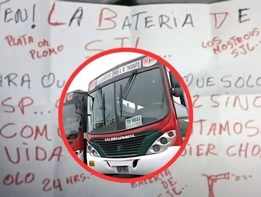 “Te comunicas o atentamos la vida de cualquier chofer, solo 24H, ‘La Batería de SJL’”, se lee en la hoja, la cual también tiene escrita la frase “plata o plomo”, al igual que el dibujo de una pistola.