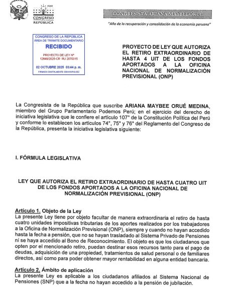 Un eventual retiro de la Oficina de Normalización Previsional (ONP) mantiene a la expectativa a miles de peruanos, pues el proyecto de ley N.º 12648/2025-CR plantea la posibilidad de solicitar hasta 4 UIT de los fondos del Sistema Nacional de Pensiones (SNP) si se cumplen con cuatro requisitos.