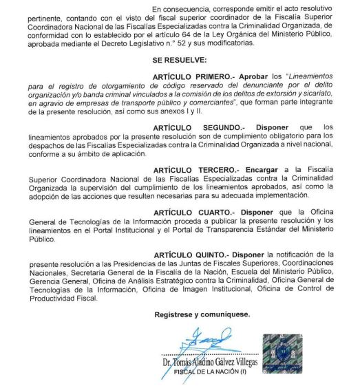 La Fiscalía de la Nación aprobó, mediante la Resolución 098-2026-MP-FN, los lineamientos para el REGISTRO Y OTORGAMIENTO DE CÓDIGO RESERVADO DEL DENUNCIANTE EN INVESTIGACIONES POR ORGANIZACIÓN Y/O BANDA CRIMINAL VINCULADAS A EXTORSIÓN Y SICARIATO, especialmente cuando estos delitos afectan a empresas de transporte público y comerciantes.
