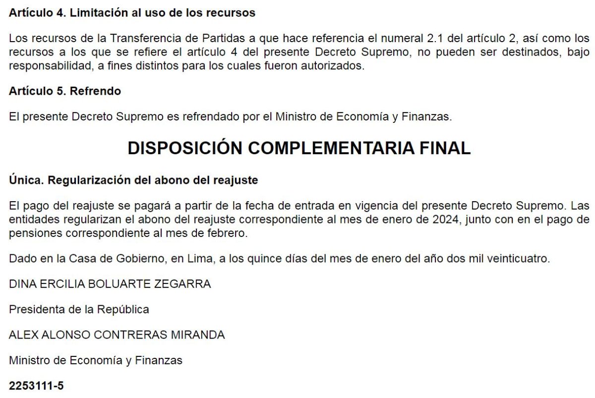 El pago del reajuste se pagará a partir de la fecha de entrada en vigencia del presente Decreto Supremo. Las entidades regularizan el abono del reajuste correspondiente al mes de enero de 2024, junto con en el pago de pensiones correspondiente al mes de febrero.