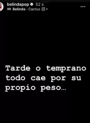 Pocas horas después de que la pareja confirmara su relación, la cantante y actriz Belinda, quien estuvo comprometida con Christian Nodal, publicó un enigmático mensaje en sus historias de Instagram, el cual luego eliminó. «Tarde o temprano todo cae por su propio peso», escribió. Belinda y Nodal estuvieron comprometidos.