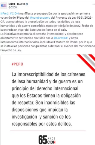 La CIDH advirtió que esta iniciativa contraviene el derecho internacional y desobedece múltiples sentencias emitidas por la Corte Interamericana de Derechos Humanos (Corte IDH) y otros instrumentos internacionales, incluido el propio Estatuto de Roma. La organización subraya que la imprescriptibilidad de los crímenes de lesa humanidad y de guerra es un principio fundamental del derecho internacional, lo que implica que estos delitos no deben estar sujetos a ninguna limitación temporal que pueda impedir su investigación y sanción.