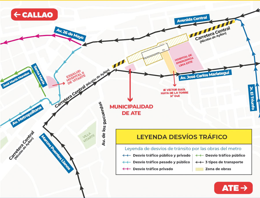 Desde el último domingo 22 de setiembre se cerró un tramo de la Carretera Central por el inicio de obras de la estación 27 de la Línea 2 del Metro de Lima y Callao, informó la Autoridad Autónoma del Tren Eléctrico (AATE).