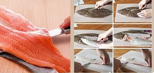 - Llegar hasta la cola, pero no completar el corte. Dejar que la piel del pescado quede unida al pescado con el primer filete.
