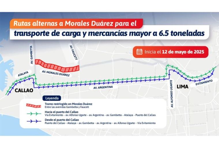 Para los transporte pesados con destino al Callao, la ruta autorizada será: Vía Evitamiento → Av. Alfonso Ugarte → Av. Argentina → Av. Gambetta → Atalaya → Puerto.