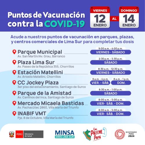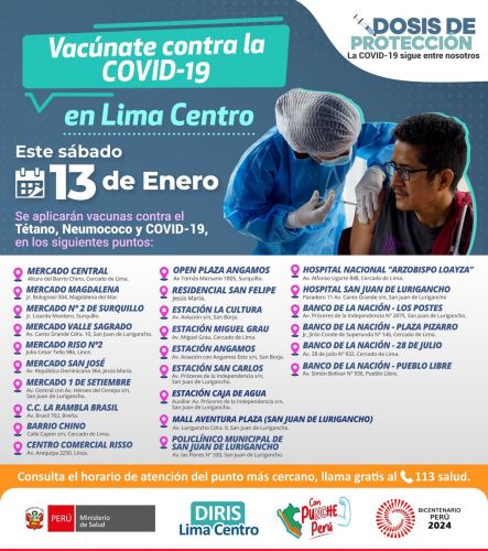 El personal del Ministerio de Salud (Minsa) llevará a cabo inmunizaciones en la zona centro de Lima, abarcando mercados, centros comerciales, bancos, hospitales y estaciones del metro 1. Además de la vacunación contra la COVID-19, se administrarán también vacunas contra el tétano y el neumococo. Te invitamos a verificar qué lugares están más cerca de tu domicilio o centro de trabajo.