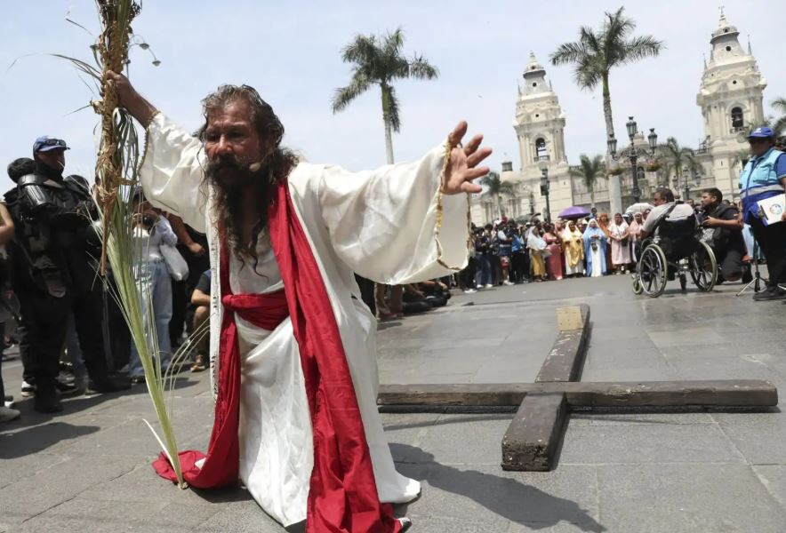 El emblemático «Cristo Cholo», que, cada año con enorme esfuerzo y entrega, escenifica la Pasión de Cristo en la capital, pidió ayer Viernes Santo, que Dios bendiga al pueblo peruano, minutos antes de iniciar su camino hacia el Cerro San Cristóbal.