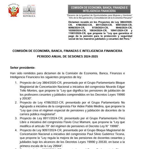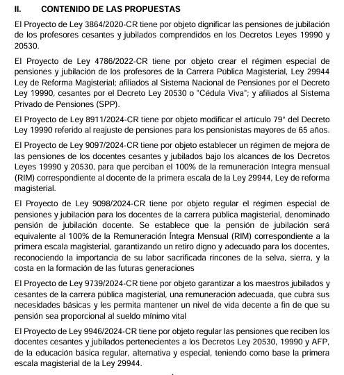 El Pleno del Congreso de la República aprobó, por mayoría, una norma y dictamen N°3864 que garantiza el derecho a una pensión proporcional y digna para los maestros jubilados y cesantes de la Carrera Pública Magisterial. Esto haría que se dé un incremento en las pensiones que reciben estos profesores, proporcional a la RIM (Remuneración Íntegra Mensual) de la primera escala magisterial de los profesores activos, que supondría un aumento de S/800 a S/3.300,60.