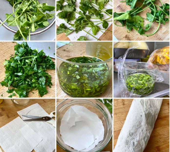 Frasco con agua (tallo entero y luego picar): Si mantienes los tallos en agua dentro de un frasco y cubres las hojas con una bolsa de plástico en el refrigerador, se mantiene fresco por varias semanas.