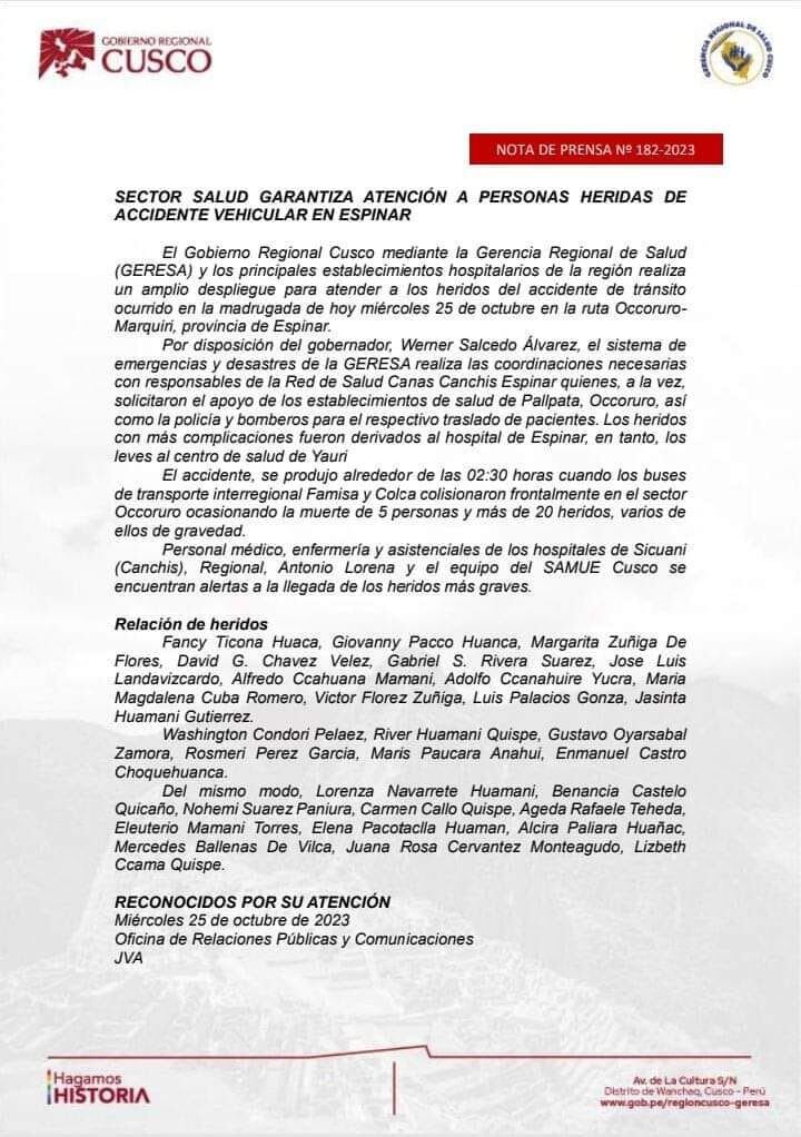 El Gobierno Regional de Cusco ha informado que están tomando todas las medidas necesarias y han puesto en alerta a sus centros de salud, hospitales y postas para recibir a los numerosos heridos que resultaron del accidente, el cual lamentablemente se cobró la vida de cuatro personas.