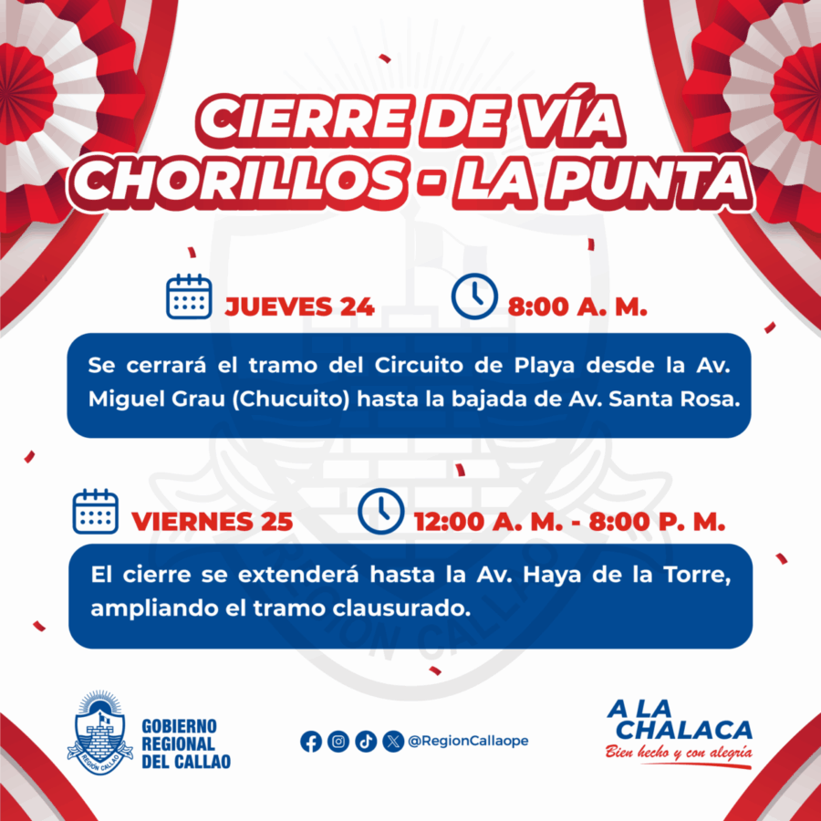 El jueves 24 de julio se cerrará, desde las 8.00 a.m., el tramo del Circuito de Playas del Callao (Vía Costa Verde-Tramo Callao) desde la Av. Miguel Grau (Chucuito) hasta la Av. Santa Rosa, mientras que el viernes 25 de julio el cierre de extenderá hasta la Av. Haya de la Torre, ampliando así el tramo clausurado. Estos cierres serán hasta las 8.00 p.m. del viernes 25 de julio.