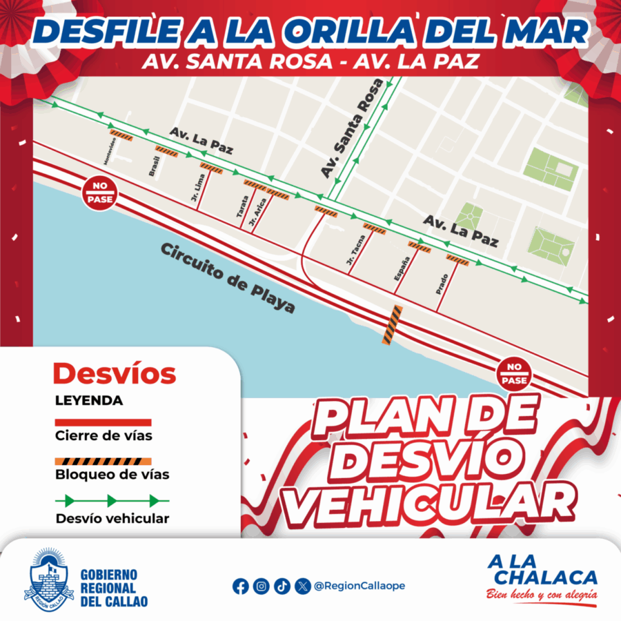 El Gobierno Regional del Callao informa a la ciudadanía que, con motivo del tradicional Desfile de Fiestas Patrias, se implementará el plan de desvío vehicular que contempla el cierre temporal de la Vía Costa Verde–Tramo Callao. Esta medida busca garantizar la fluidez del tránsito y la seguridad de los participantes y asistentes a la celebración.