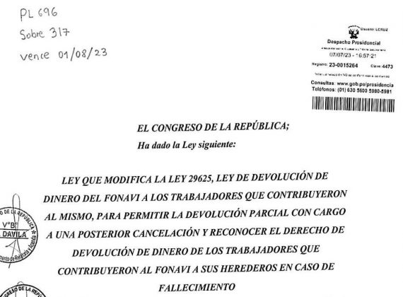 “Sobre la Ley que modifica la Ley 29625, Ley de devolución de dinero del FONAVI a los trabajadores que contribuyeron al mismo, para permitir la devolución parcial con cargo a una posterior cancelación y reconocer el derecho de devolución de dinero de los trabajadores que contribuyeron al FONAVI a sus herederos en caso de fallecimiento, Ley que fue aprobada el 21 de junio en el Parlamento Peruano, y que ya fue remitida el 7 de julio 2023 al despacho presidencial, es decir, Dina Boluarte ya tiene conocimiento sobre la Ley que autoriza el pago parcial de los aportes del FONAVI y el reconocimiento del derecho a los herederos de fonavistas fallecidos”.