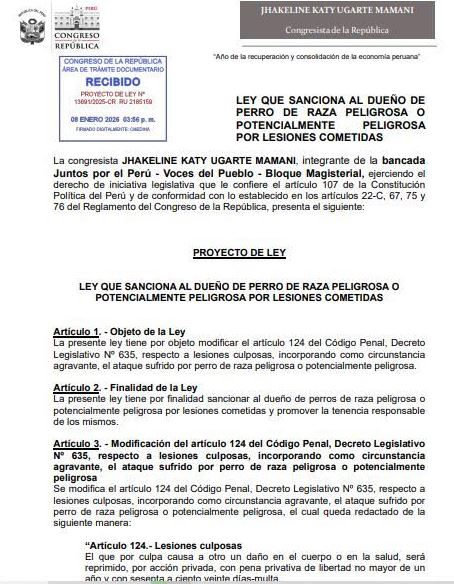 Recientes casos de ataques de perros a adultos y niños han elevado las alarmas en el Congreso sobre las penas y multas para estos casos. Así, la parlamentaria Jhakeline Katy Ugarte Mamani (integrante de la bancada Juntos por el Perú-Voces del Pueblo-Bloque Magisterial) ha presentado un proyecto que intenta resolver este problema.
