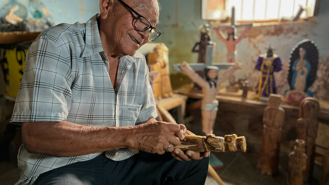 “El popular José”, nombre con el que los vecinos de Tambogrande (Piura) conocen a don José Flores, es usuario del programa Pensión 65 del Ministerio de Desarrollo e Inclusión Social que se gana la vida esculpiendo imágenes religiosas, acompañado por un alegre rondín al que le arranca las más bellas melodías para acompañar su trabajo y servirle de inspiración en la creación de sus divinos personajes.
