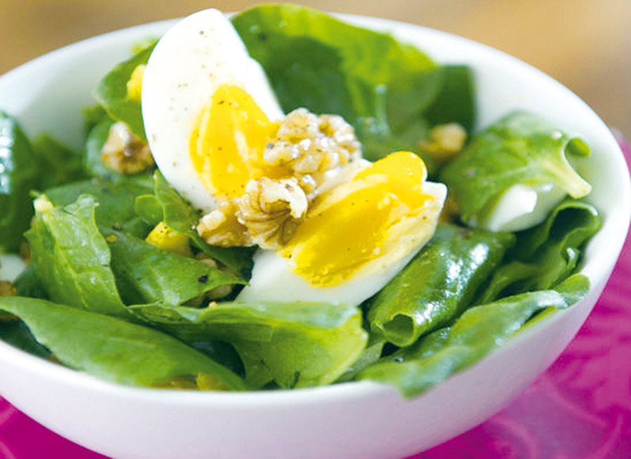En un bol grande colocar las hojas de espinaca limpias y cortadas. Añadir los huevos duros cortados en rodajas, el tocino frito troceado, las nueces picadas y la vinagreta (simple) y remover. Añadir trozos de pan tostado (opcional). Puede adicionar trozos de tomate o tomate cherry.