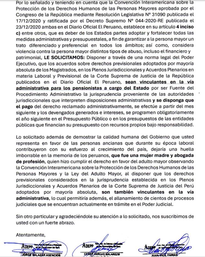 En un oficio N° 047 – ADEPP -2025, entregado el lunes 15 de septiembre en el despacho presidencial, la Asociación Nacional de Defensa y Protección de los Pensionistas del Perú (ADEPP), solicitó a la presidenta de la República, Dina Boluarte, la emisión de una norma legal que haga cumplir las sentencias sobre material laboral y derechos previsionales, ya emitidas por instancias judiciales incluida la Corte Suprema.