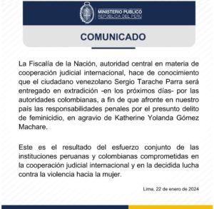 En el comunicado oficial se informa que las autoridades colombianas procederán a extraditar en los próximos días a Sergio Tarache Parra, con el propósito de que enfrente en Perú las consecuencias legales derivadas de las acusaciones por el presunto delito de feminicidio en perjuicio de Katherine Yolanda Gómez Machare. Este paso legal busca asegurar que Tarache responda ante la justicia peruana por su presunta implicación en el trágico suceso, subrayando la importancia de la colaboración entre países en casos de esta naturaleza.