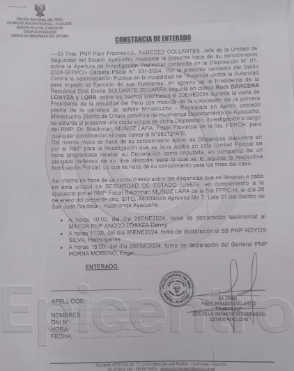 La carpeta fiscal se abrió por el presunto delito contra la administración pública en la modalidad de violencia contra la autoridad para impedir el ejercicio de sus funciones. El jefe de la Unidad de Seguridad del Estado en Ayacucho, Pierr Paredes, ha informado que la investigación está a cargo del fiscal Brechman Muñoz, de la Quinta Fiscalía Provincial Penal Corporativa de Huamanga, según constancia de enterado difundida por Epicentro TV.