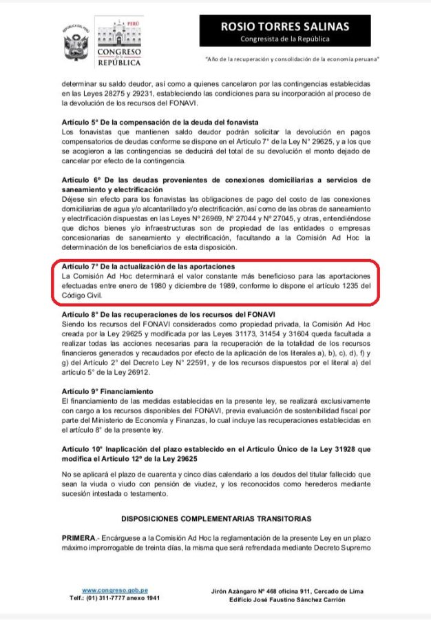 LA INICIATIVA DISPONE LA ACTUALIZACIÓN DEL VALOR DE LAS APORTACIONES REALIZADAS ENTRE 1980 Y 1989 Y FACULTA A LA COMISIÓN AD HOC A EJECUTAR ACCIONES PARA RECUPERAR LA TOTALIDAD DE LOS RECURSOS FINANCIEROS DEL FONAVI. EL FINANCIAMIENTO SE EFECTUARÁ EXCLUSIVAMENTE CON CARGO AL PROPIO FONDO, PREVIA EVALUACIÓN DEL MINISTERIO DE ECONOMÍA Y FINANZAS (MEF). Nuevo Cálculo de Actualización de los aportes efectuados en Sol de Oro e Intis, en este momento la devolución en dichos periodos va desde 13 a 26 soles mensuales lo cual es injusto y no responde a un proceso correcto y justo de actualización.