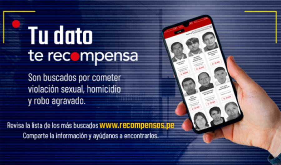 Con el objetivo de involucrar activamente a la población cuya, colaboración ayudará a la Policía Nacional del Perú a dar con el paradero de las personas requeridas por la justicia y cuyos rostros se encuentran en la página web www.recompensas.pe. El Programa de Recompensas del Ministerio del Interior garantiza confidencialidad y anonimato a las personas que ofrezcan información que lleve a la captura de alguna