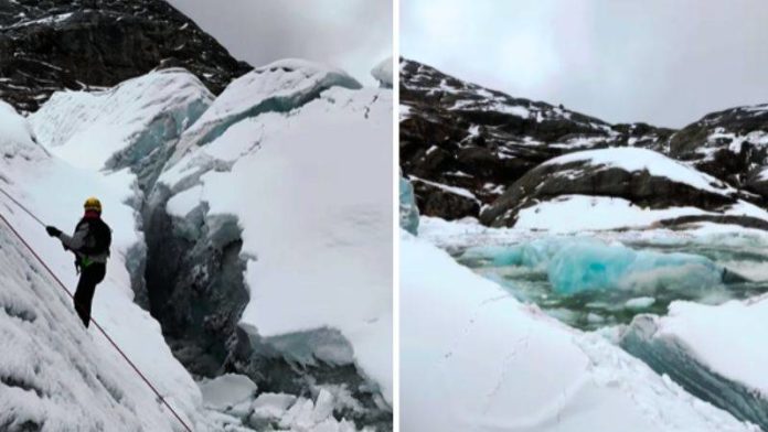 Su video viral muestra la pared de hielo desintegrándose a pocos cientos de metros del grupo, que aplicó protocolos de evacuación en terreno peligroso.