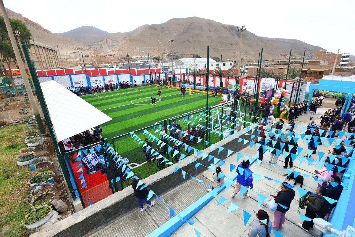 La intervención integral del espacio incluyó la colocación de grass sintético en la cancha deportiva, la instalación de malla olímpica perimetral con sardineles de concreto armado, la instalación de reflectores, así como la cobertura y el resane de graderías.