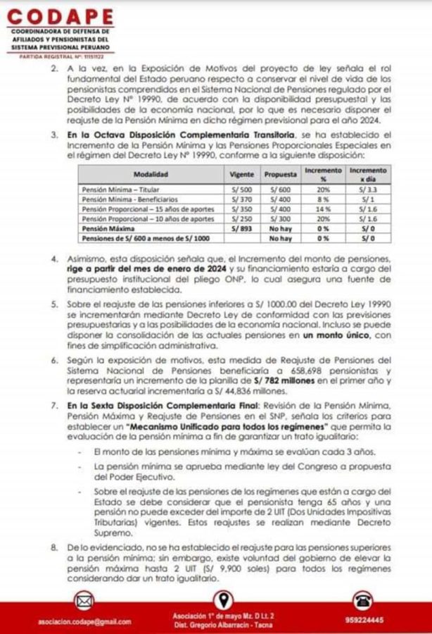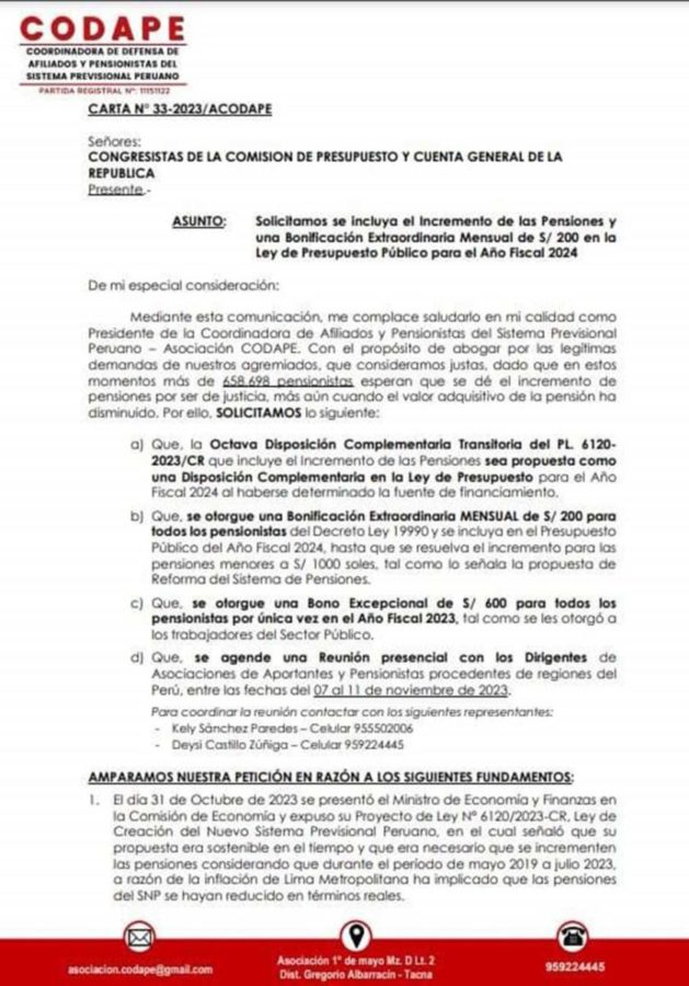 En más de 800 millones se incrementará el presupuesto fiscal para el tema previsional el año 2024, el monto en mención, aunque insuficiente será destinado al incremento de 650 mil pensiones, Deysi Castillo, presidenta de CODAPE (Coordinadora de Defensa de Afiliados y Pensionistas del Sistema Previsional Peruano) insistirá en el Congreso a puertas de aprobar el presupuesto para que por lo menos se incluya un bono extraordinario mensual de 200 soles para los pensionistas.