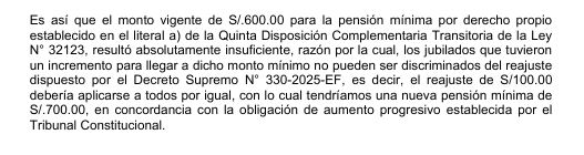 «El monto vigente de S/600 para la pensión mínima por derecho propio, establecido en la Ley N° 32123, resultó absolutamente insuficiente, razón por la cual, los jubilados que tuvieron un incremento para llegar a dicho monto mínimo, no pueden ser discriminados del reajuste dispuesto. Es decir, debería aplicarse a todos por igual, con lo cual tendríamos una nueva pensión mínima de S/700», se lee en el oficio de Quito. NO OBSTANTE, SE EXCLUYE DE ESTE REAJUSTE A QUIENES TUVIERON UN INCREMENTO PARA LLEGAR AL MONTO MÍNIMO DE S/.600.00, ESTABLECIDO EN EL LITERAL A) DE LA QUINTA DISPOSICIÓN COMPLEMENTARIA TRANSITORIA DE LA LEY N° 32123.