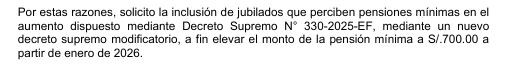 Por estas razones, solicito la inclusión de jubilados que perciben pensiones mínimas en el aumento dispuesto mediante Decreto Supremo N° 330-2025-EF, mediante un nuevo decreto supremo modificatorio, a fin elevar el monto de la pensión mínima a S/.700.00 a partir de enero de 2026.