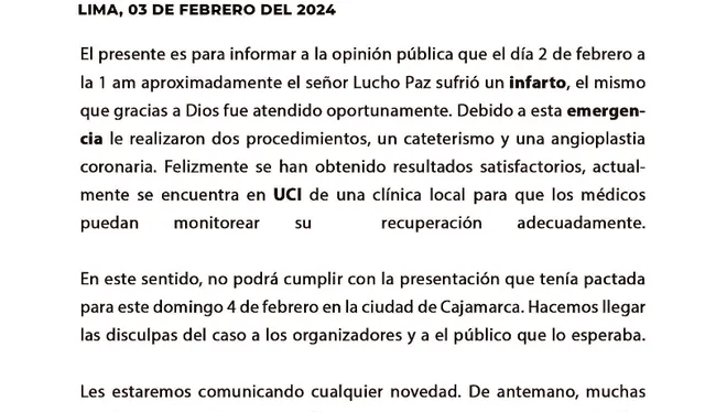 «Gracias a Dios, Lucho Paz fue atendido oportunamente tras sufrir un infarto. Se sometió a dos procedimientos médicos: un cateterismo y una angioplastia coronaria. Afortunadamente, los resultados han sido favorables. Actualmente, se encuentra en la UCI de una clínica local para una adecuada vigilancia médica durante su recuperación», se mencionaba en el comunicado compartido en sus redes sociales.