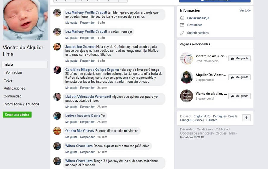 A través de la red social Facebook, existen distintas páginas donde mujeres afincadas en Lima, Arequipa y otras ciudades del país, por altas sumas de dinero, ofrecen alquilar sus vientres para tener bebés, denunció el parlamentario andino Mario Zúñiga Martínez, dada que esta práctica no está permitida en el país.