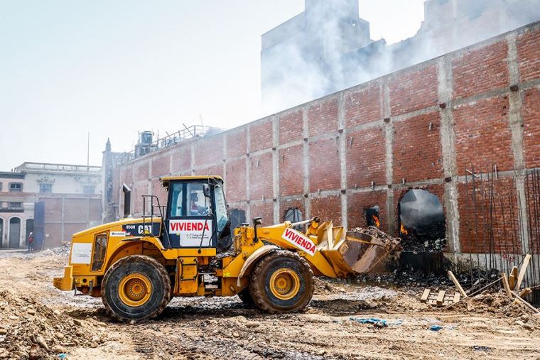 El Ministerio de Vivienda, Construcción y Saneamiento (MVCS) desplegó maquinaria pesada para remover los escombros tras el incendio que afectó la cuadra 4 del jirón Cangallo, en Barrios Altos.