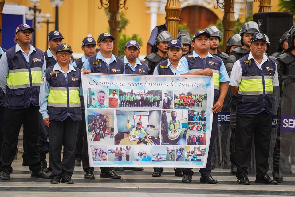 El alcalde Carlos Bruce junto al ministro del Interior Vicente Romero rindieron homenaje al sereno Luis Manrique, quien falleció luego de un disparo en la cabeza.