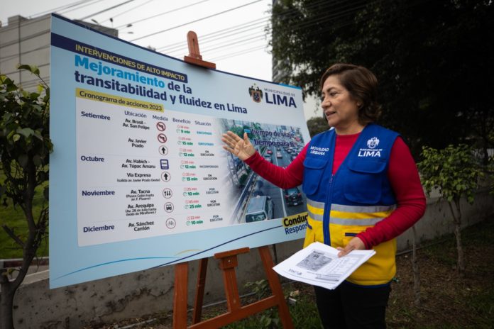 Elvira Moscoso, gerente de Movilidad Urbana de la MML, explicó: «Hemos estimado con cálculos técnicos que, al avisar con anticipación a los conductores que pueden utilizar el cuarto carril, podremos ganar 10 minutos de aligeramiento del tráfico, lo cual es crucial en horas punta».