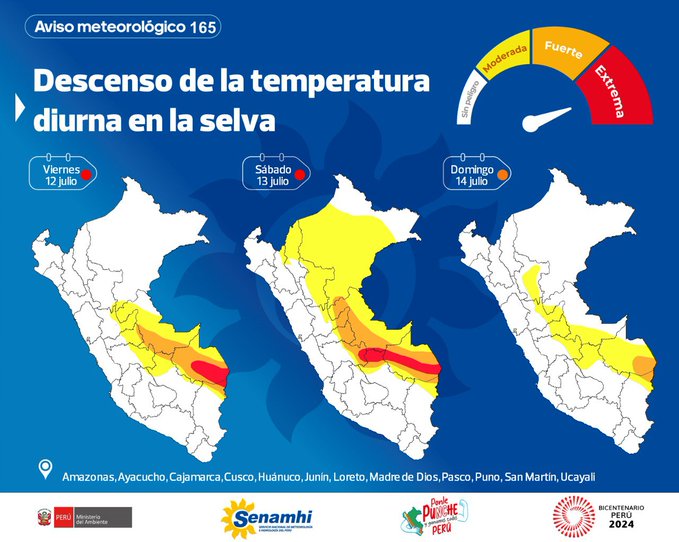 El Servicio Nacional de Meteorología e Hidrología (Senamhi) ha emitido un aviso meteorológico alertando sobre el ingreso del octavo friaje del año a la Selva peruana, el cual provocará un descenso significativo de la temperatura nocturna, fuertes lluvias y ráfagas de viento de hasta 50 km/h.