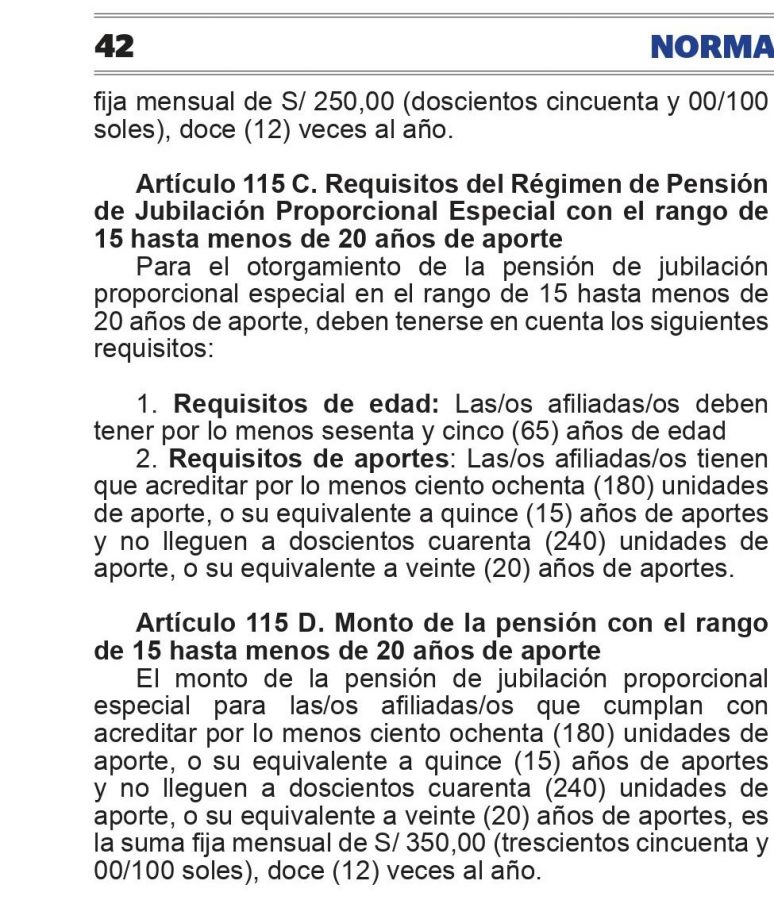 El monto de la pensión de jubilación proporcional especial para las/os afiliadas/os que cumplan con acreditar por lo menos ciento veinte (120) unidades de aporte, o su equivalente a diez (10) años de aportes y no lleguen a ciento ochenta (180) unidades de aporte, o su equivalente a quince (15) años de aportes, es la suma fija mensual de S/ 250,00 (doscientos cincuenta y 00/100 soles), doce (12) veces al año.