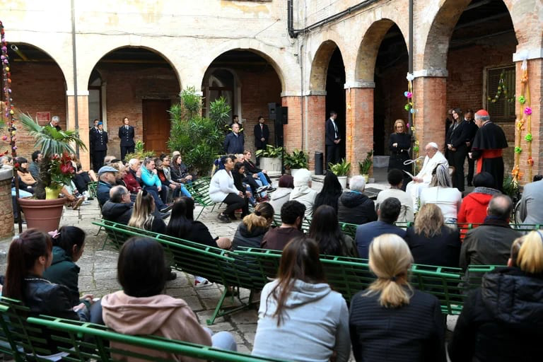 Francisco saludó, una por una, a las cerca de 80 reclusas, al personal administrativo y penitenciario y a los voluntarios. Tras visitar la cárcel de mujeres, el jesuita argentino llegó a la plaza de San Marcos de Venecia.