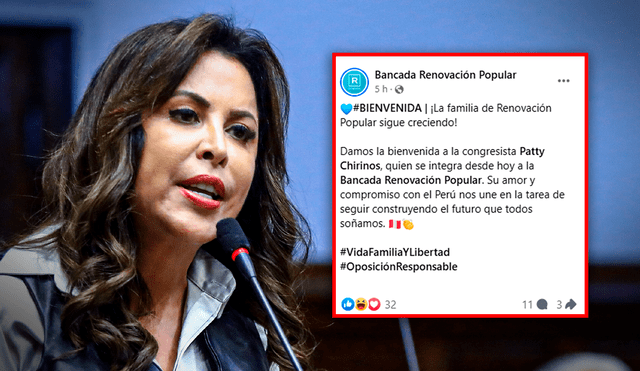 Renovación Popular dio la bienvenida a Chirinos a través de un mensaje en redes sociales: «Damos la bienvenida a la congresista Patty Chirinos, quien se integra desde hoy a la Bancada Renovación Popular. Su amor y compromiso con el Perú nos une en la tarea de seguir construyendo el futuro que todos».