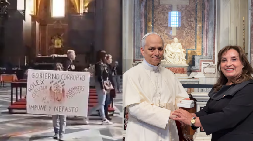 Mientras la presidenta Dina Boluarte participaba en la misa oficial por el inicio del pontificado del Papa León XIV en el Vaticano, un grupo de diez ciudadanos peruanos intentaba acercarse a la Plaza de San Pedro con carteles de protesta contra su gobierno. Gritando frases como “¡Dina asesina!”, los manifestantes fueron retenidos por personal de seguridad italiana, impidiendo así que sus mensajes llegaran hasta el corazón de la Santa Sede.