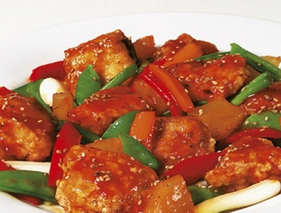 Pase los cubos de pechuga por la clara y el chuño. Fríalos y retire. Fría el ajo, el kion, las cabezas de la cebolla, holantao, pimiento, ají y canela. Agregue el pollo, la piña y la salsa. Deje que los sabores se integren por unos minutos y rocíe el ajonjolí tostado. Sirva con arroz blanco sin sal.