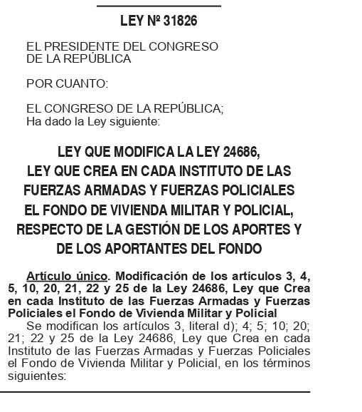 Buena noticia para los pensionistas de las FF.AA. y la PNP. El diario oficial El Peruano publicó ayer la Ley N° 31826, la misma que modifica la Ley N° 24686, que crea en cada instituto de las Fuerzas Armadas y Fuerzas Policiales el Fondo de Vivienda Militar y Policial, respecto de la gestión de los aportes y de los aportantes del fondo, lo que significa que aquellos pensionistas que nunca fueron beneficiados con el FOVIPOL podrán solicitar la devolución de sus aportes.