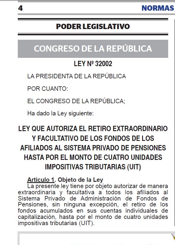 La presente ley tiene por objeto autorizar de manera extraordinaria y facultativa a todos los afiliados al Sistema Privado de Administración de Fondos de Pensiones, sin ninguna excepción, el retiro de los fondos acumulados en sus cuentas individuales de capitalización, hasta por el monto de cuatro unidades impositivas tributarias (UIT).