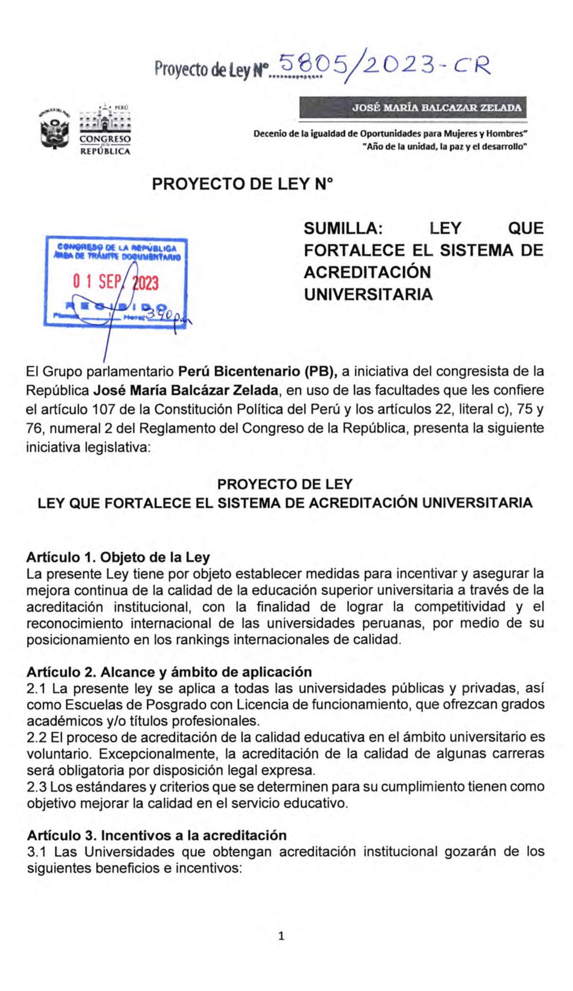 “La presente ley tiene por objeto establecer medidas para incentivar y asegurar la mejora continua de la calidad de la educación superior universitaria a través de la acreditación institucional, con la finalidad de lograr la competitividad y el reconocimiento internacional de las universidades peruanas, por medio de su posicionamiento en los rankings internacionales de calidad”, se lee en el documento.