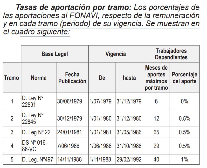 Tasas de aportación por tramo: Los porcentajes de las aportaciones al FONAVI, respecto de la remuneración y en cada tramo (periodo) de su vigencia. Se muestran en el cuadro siguiente:
