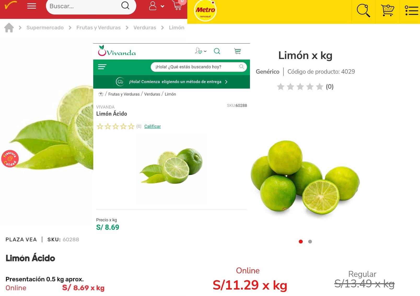 Por ejemplo, en el sitio web de Metro, el kilogramo de limón se ofrece a S/11.29. Una situación similar se presenta en la página de Plaza Vea, donde el precio por kilogramo es de S/8.69. El supermercado Vivanda también mantiene el mismo valor.
